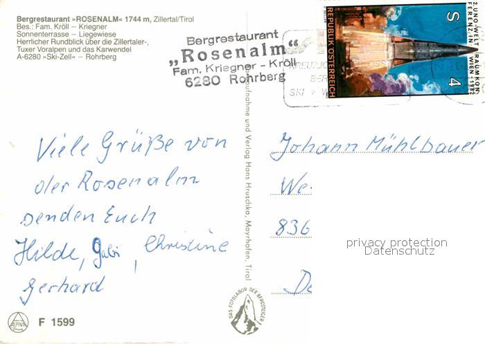 72654218 alte Postkarte Rohrberg Tirol Bergrestaurant Rosenalm Terrasse postalisch gelaufen Erhaltung siehe scans [WerneD78] KatCode: 11390335070924