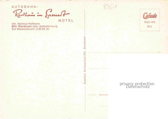 74055695 Rohrbrunn Autobahn-Rasthaus im Spessart postalisch nicht gelaufen Erhaltung siehe scans [FriedD77] KatCode: 11110009671157