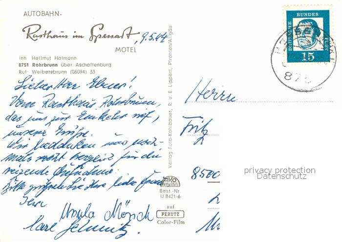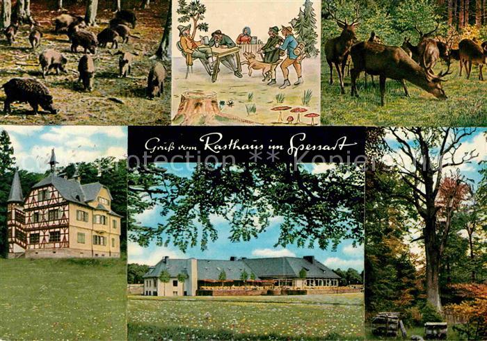 72827094 alte Postkarte Rohrbrunn Autobahn Rasthaus im Spessart Motel Tierpark Wildschweine Damwild Karikaturen postalisch gelaufen Erhaltung siehe scans [FriedD77] KatCode: 11110009671157