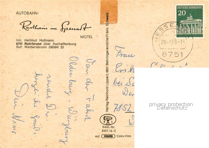 73636159 alte Postkarte Rohrbrunn Autobahn Rasthaus im Spessart Wildgehege mit Schwarz und Rotwild postalisch gelaufen Erhaltung siehe scans [WerneD78] KatCode: 11110009671157