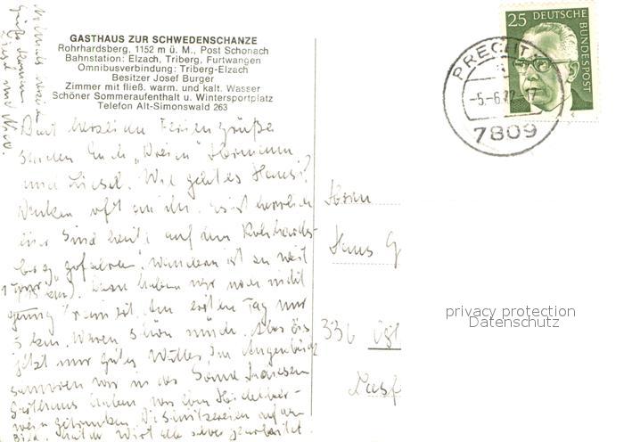 73726261 alte Postkarte Rohrhardsberg Schonach Schaenke im Gasthaus zur Schwedenschanze postalisch gelaufen Erhaltung siehe scans [FriedD77] KatCode: 11110008326055