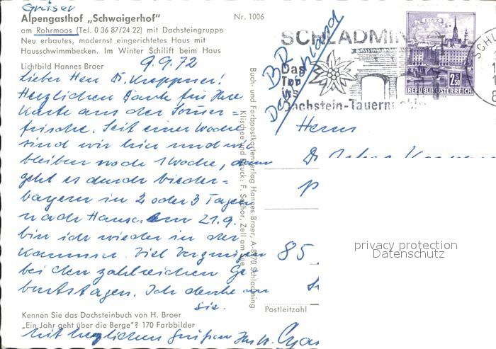 72465129 alte Postkarte Rohrmoos Schladming Alpengasthof Schwaigerhof postalisch gelaufen Erhaltung siehe scans KatCode: 11390222061242
