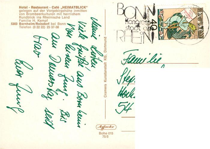 73884406 alte Postkarte Roisdorf Bornheim Hotel Restaurant Cafe Heimatblick Panorama Blick auf Bonn und das Siebengebirge postalisch gelaufen Erhaltung siehe scans [FriedD77] KatCode: 11110005382012