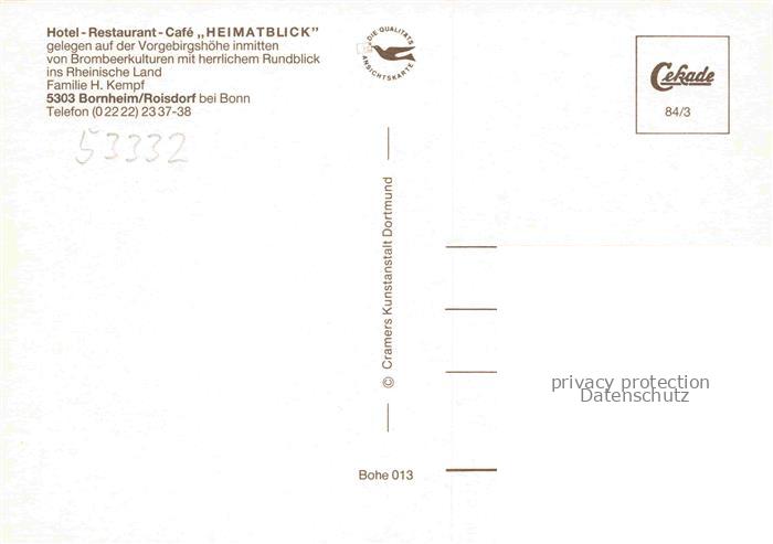 74040721 Roisdorf Bornheim Hotel Restaurant Café Heimatblick Terrasse postalisch nicht gelaufen Erhaltung siehe scans [FriedD77] KatCode: 11110005382012