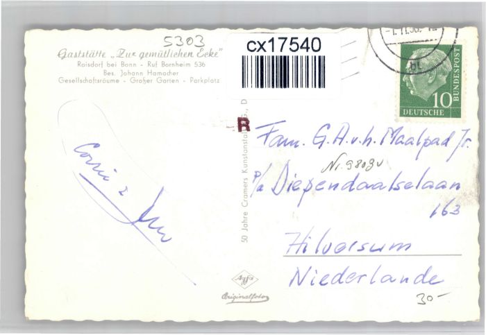 30725071 alte Postkarte Roisdorf Gaststaette zur gemuetlichen Ecke x postalisch gelaufen KatCode: 11110005382012