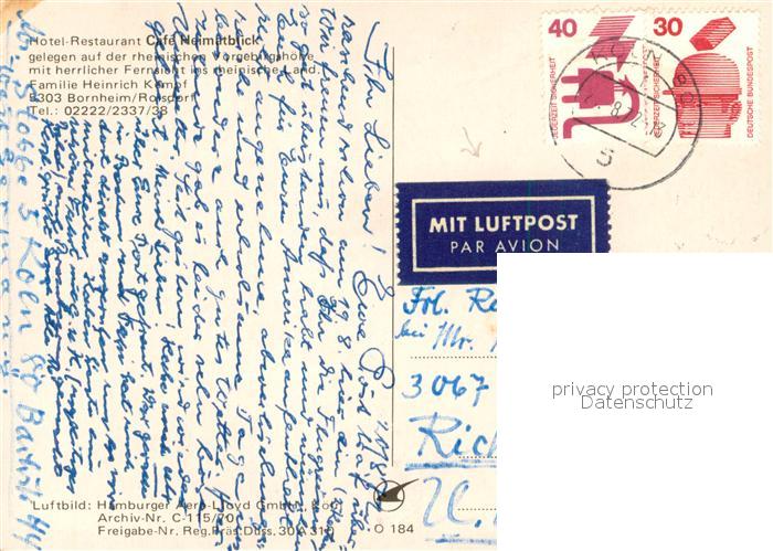 73647833 alte Postkarte Roisdorf Hotel Restaurant Cafe Heimatblick Fliegeraufnahme postalisch gelaufen Erhaltung siehe scans [FriedD77] KatCode: 11110005382012