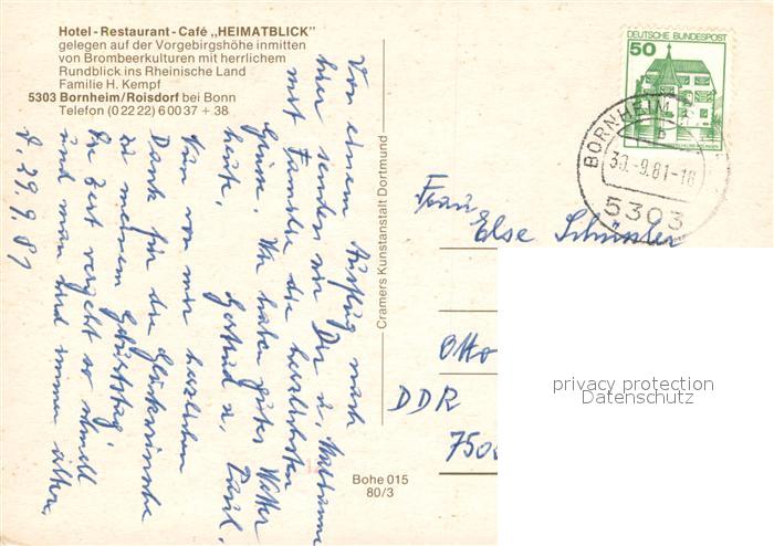 73725995 alte Postkarte Roisdorf Hotel Restaurant Cafe Heimatblick Panorama Rheinisches Land Bonn Siebengebirge postalisch gelaufen Erhaltung siehe scans [FriedD77] KatCode: 11110005382012