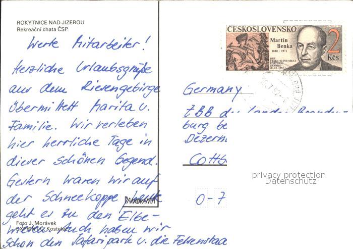 old postcard Rokytnice nad Jizerou Rekreacni chata CSP postalisch gelaufen Erhaltung siehe scans