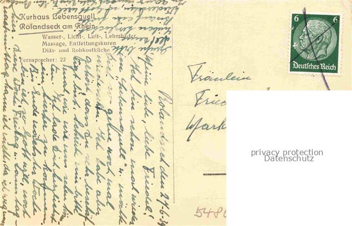 74130721 alte Postkarte ROLANDSECK Remagen Ahrweiler Rheinland-Pfalz Panorama Blick vom Rolandsbogen auf Kurhaus Lebensquell postalisch gelaufen Erhaltung siehe scans [FriedD77] KatCode: 11110007131070