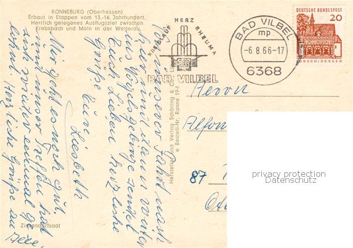 73845831 alte Postkarte Ronneburg Hessen Zinsendorfsaal Ausflugsziel Restaurant postalisch gelaufen Erhaltung siehe scans [FriedD77] KatCode: 11110006435024