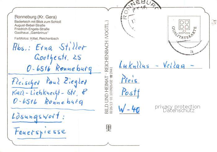 73814325 alte Postkarte Ronneburg Thueringen Baderteich mit Schloss August Bebel Strasse Friedrich Engels Strasse Gasthaus Gambrinus postalisch gelaufen Erhaltung siehe scans [FriedD77] KatCode: 11110016076061