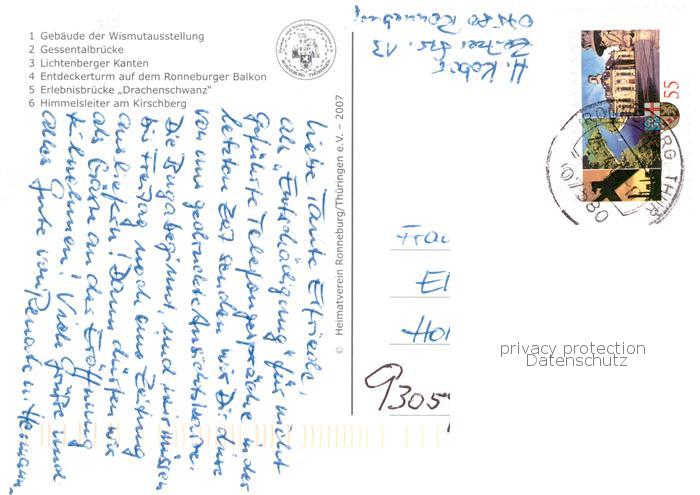 73840374 alte Postkarte Ronneburg Thueringen Wismutausstellung Gessentalbruecke Lichtenberger Kanten Entdeckerturm Erlebnisbruecke Drachenschwanz Himmelsleiter am Kirschberg postalisch gelaufen Erhaltung siehe scans [FriedD77] KatCode: 11110016076061
