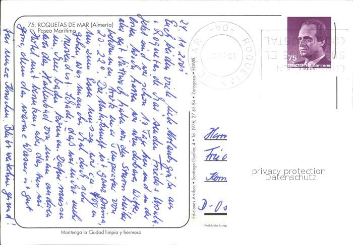old postcard Roquetas de Mar Paseo Maritima Promenade Palmen Hotel postalisch gelaufen Erhaltung siehe scans
