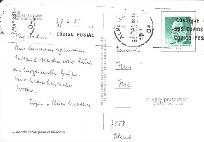 old postcard Roquetas de Mar Schwimmbad Fischerboot Hotel postalisch gelaufen Erhaltung siehe scans