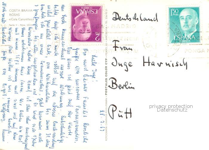 old postcard Rosas Costa Brava Cataluna Cala Canyelles Kuestenort postalisch gelaufen Fliegeraufnahme Erhaltung siehe scans [FriedD77]