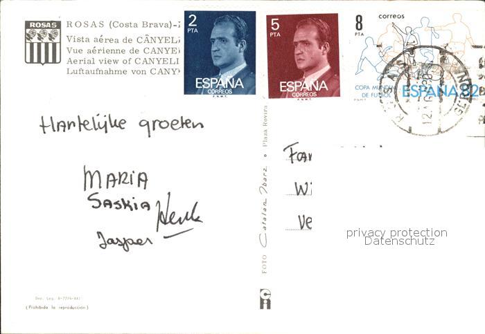 old postcard Rosas Costa Brava Cataluna Fliegeraufnahme postalisch gelaufen Erhaltung siehe scans