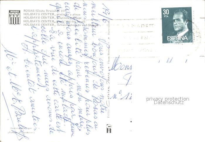 old postcard Rosas Costa Brava Cataluna Holidays Center Schwimmbad Strand postalisch gelaufen Erhaltung siehe scans