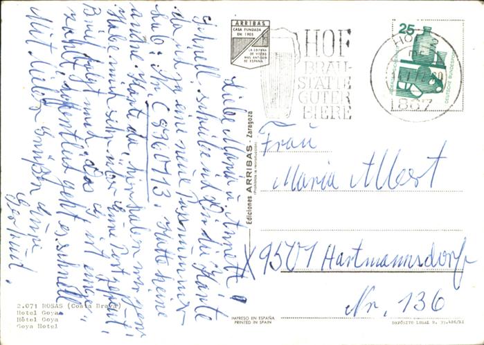 old postcard Rosas Costa Brava Cataluna Hotel Goya postalisch gelaufen