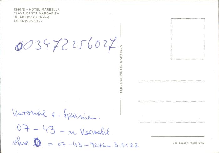 Rosas Costa Brava Cataluna Hotel Marbella Playa Santa Margarita Restaurante postalisch nicht gelaufen Erhaltung siehe scans