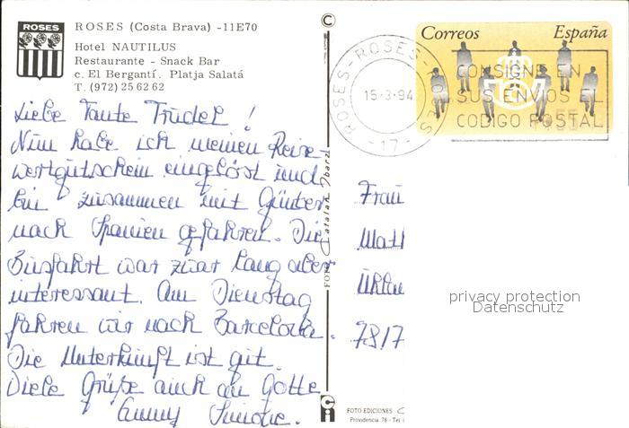 old postcard Rosas Costa Brava Cataluna Hotel Nautilus Teilansichten Swimmingpool postalisch gelaufen Erhaltung siehe scans