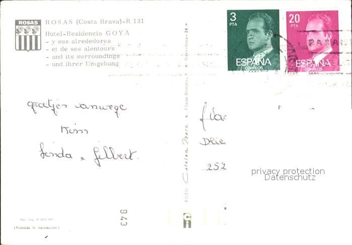 old postcard Rosas Costa Brava Cataluna Hotel Residencia Goya Swimmingpool Strandpartien postalisch gelaufen Erhaltung siehe scans