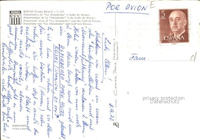 old postcard Rosas Costa Brava Cataluna Panoramica de La Almadraba y Golfo de Rosas postalisch gelaufen Erhaltung siehe scans