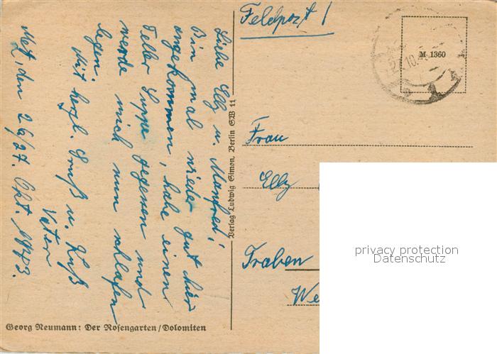 old postcard Rosengarten Catinaccio Georg Neumann Berghaus postalisch gelaufen Feldpostkarte Erhaltung siehe scans [PaolaD17]