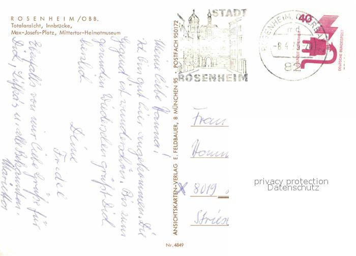 72739034 alte Postkarte Rosenheim Bayern Totalansicht Innbruecke Max Josefs Platz Mittertor Heimatmuseum postalisch gelaufen Erhaltung siehe scans [FriedD77] KatCode: 11110009163000