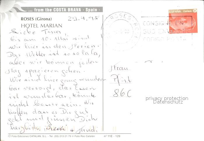 old postcard Roses Costa Brava Hotel Marian Strand postalisch gelaufen Erhaltung siehe scans