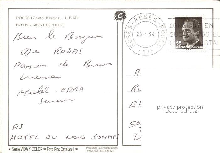 old postcard Roses Costa Brava Hotel Montecarlo postalisch gelaufen Erhaltung siehe scans