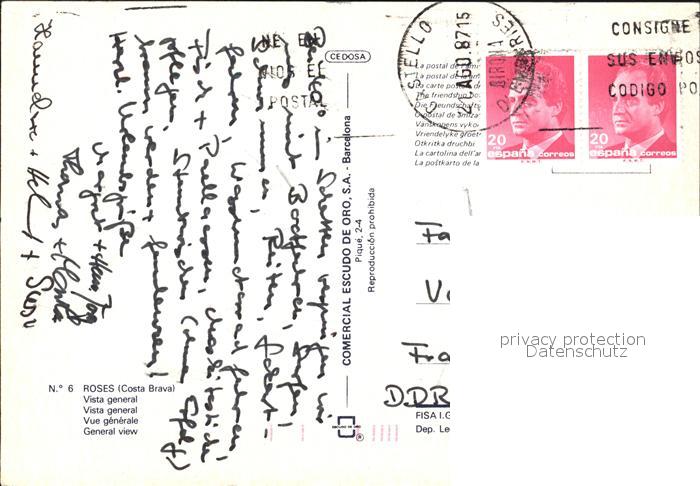 alte Postkarte Roses Costa Brava Vista general Panorama Strand Kueste postalisch gelaufen Erhaltung siehe scans