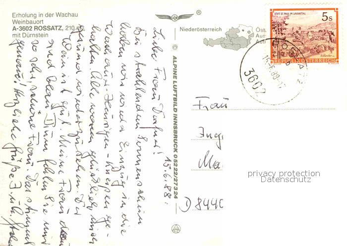 72673316 alte Postkarte Rossatz-Arnsdorf mit Duernstein Wachau Donau Fliegeraufnahme postalisch gelaufen Erhaltung siehe scans [FriedD77] KatCode: 11390124031338