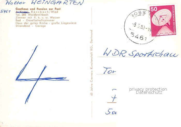 72749333 alte Postkarte Rossbach Wied Gasthaus Pension zur Post postalisch gelaufen Erhaltung siehe scans [LiesaD40] KatCode: 11110007138065