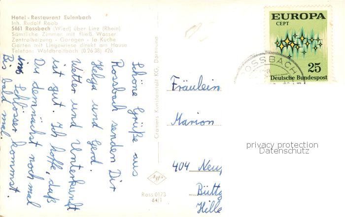 73792622 alte Postkarte Rossbach Wied Gesamtansicht u. Hotel-Restaurant Eulenbach m. Garten u. Liegewiese postalisch gelaufen Erhaltung siehe scans [LiesaD40] KatCode: 11110007138065