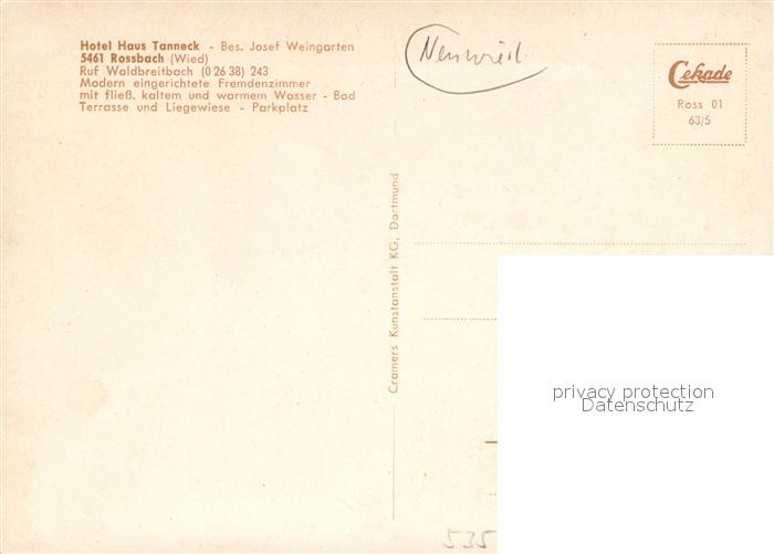 73711179 Rossbach Wied Hotel Haus Tanneck Aussenansicht postalisch nicht gelaufen Erhaltung siehe scans [LiesaD40] KatCode: 11110007138065