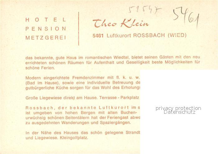 73569921 Rossbach Wied Hotel Pension Theo Klein postalisch nicht gelaufen Erhaltung siehe scans [WerneD78] KatCode: 11110007138065