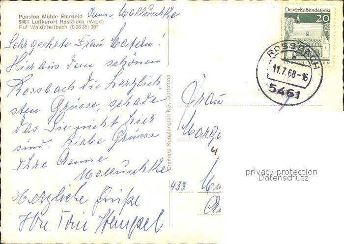 71940280 alte Postkarte Rossbach Wied Pension Muehle Etscheid postalisch gelaufen Erhaltung siehe scans KatCode: 11110007138065
