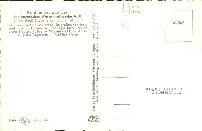 32214104 Rosshaupten Forggensee Kantine Lechspeicher der Bayerischen Wasserkraftwerke A.- G postalisch nicht gelaufen Erhaltung siehe scans KatCode: 11110009777166