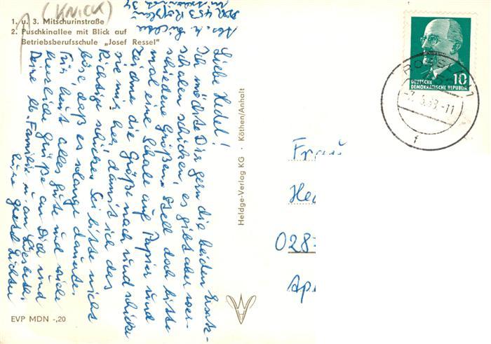 73894791 alte Postkarte Rosslau Elbe Mitschurinstrasse Puschkinallee mit Blick auf Betriebsberufsschule Josef Ressel postalisch gelaufen Erhaltung siehe scans [FriedD77] KatCode: 11110015001000