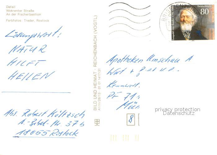 73654906 ROSTOCK CITY Detail Wokrenter Strasse An der Fischerbastion postalisch gelaufen Erhaltung siehe scans [WerneD78] alte Postkarte Wern Katcode 11110013003000