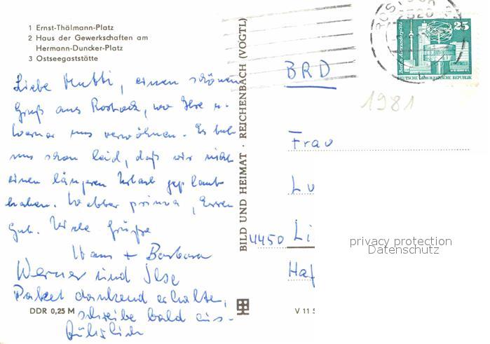 72899594 alte Postkarte ROSTOCK CITY Ernst-Thaelmann-Platz Ostseegaststaette Haus der Gewerkschaften postalisch gelaufen Erhaltung siehe scans [PaolaD17] KatCode: 11110013003000