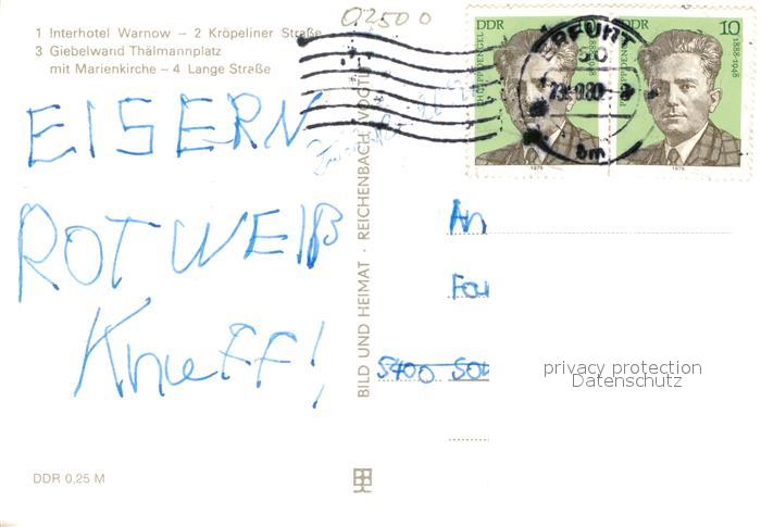 72939088 alte Postkarte ROSTOCK CITY Interhotel Warnow Kroepeliner Strasse Giebelwand Thaelmannplatz postalisch gelaufen Erhaltung siehe scans [NatalD47] KatCode: 11110013003000