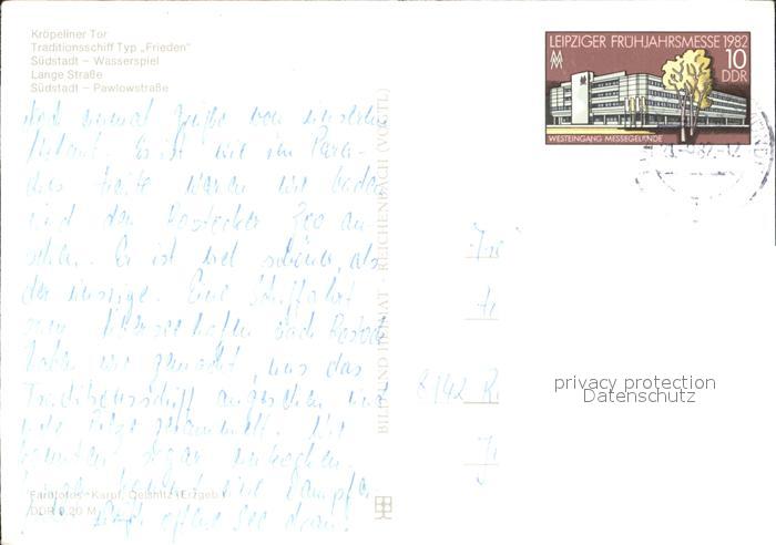 72329450 alte Postkarte ROSTOCK CITY Kroepeliner Tor Traditionsschiff Typ Frieden Suedstadt Wasserspiele Lange Strasse Pawlostrasse postalisch gelaufen Erhaltung siehe scans KatCode: 11110013003000