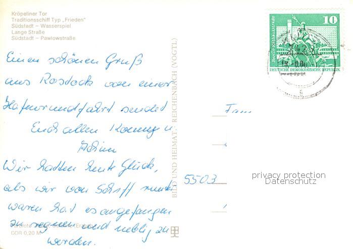 73066564 alte Postkarte ROSTOCK CITY Kroepeliner Tor Traditionsschiff Typ Frieden Suedstadt Wasserspiel Lange Str Pawlowstr postalisch gelaufen Erhaltung siehe scans [WerneD78] KatCode: 11110013003000