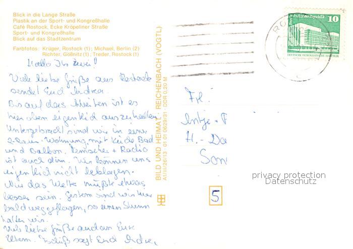 73071386 alte Postkarte ROSTOCK CITY Lange Strasse Plastik an der Sport- Kongresshalle Stadtzentrum postalisch gelaufen Erhaltung siehe scans [NatalD47] KatCode: 11110013003000