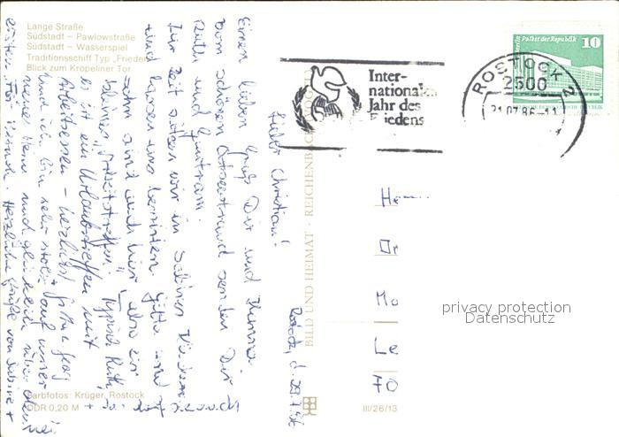 72156571 alte Postkarte ROSTOCK CITY Lange Strasse Suedstadt Pawlowstr Wasserspiel Traditionsschiff Typ Frieden Kroepeliner Tor postalisch gelaufen Erhaltung siehe scans KatCode: 11110013003000