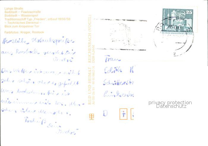 72136063 alte Postkarte ROSTOCK CITY Wohnblocks Wasserspiel Traditionsschiff Typ Frieden Denkmal Kroepeliner Tor postalisch gelaufen KatCode: 11110013003000