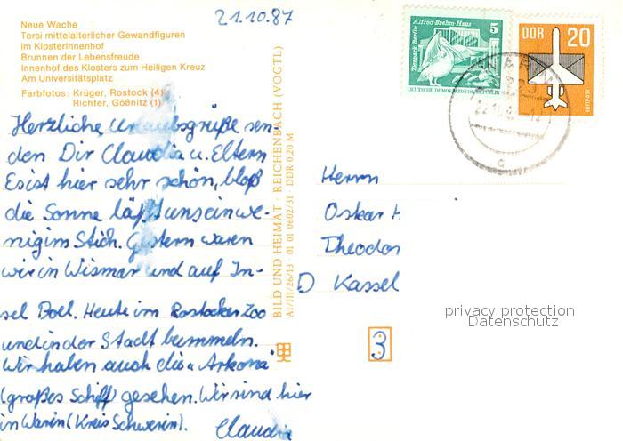 73204009 alte Postkarte Rostock Neue Wache Klosterinnenhof Universitaetsplatz postalisch gelaufen Erhaltung siehe scans [NatalD47] KatCode: 11110013003000