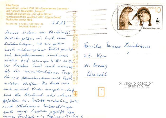 73013590 alte Postkarte Rostock-Warnemuende Alter Strom Leuchtturm Teepott FDGB Erholungsheim Am Alten Strom Fahrgastschiff Fischkutter postalisch gelaufen Erhaltung siehe scans [WerneD78] KatCode: 11110013003000