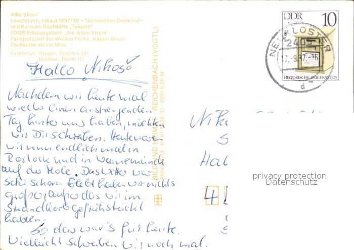 72306638 alte Postkarte Rostock-Warnemuende Alter Strom Techn Denkmal FDGB Erholungsheim Am Alten Strom MS Kaeppn Brass Fischkutter an der Mole postalisch gelaufen Erhaltung siehe scans KatCode: 11110013003000